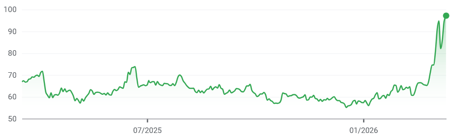 Preço do crude em dólares, ao longo dos últimos 365 dias.